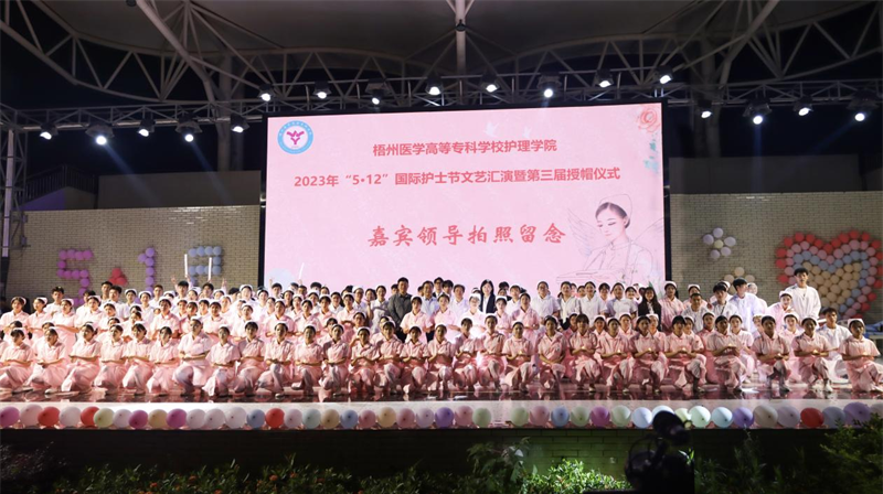 由梧州医学高等专科学校护理学院主办的“5·12”国际护士节文艺汇演暨第三届授帽仪式于梧医运动场隆重举行。 学校党委书记黎洪锋表示,护理学院师生要继承和发扬南丁格尔精神,以严谨的态度、精湛的技术和丰富的知识武装自己,在专业领域用不懈的努力和辛勤的汗水书写梧医的新辉煌,并向大家致以节日的问候和衷心的祝福。党委书记黎洪锋 学校护理学院院长刘承伟指出,作为一名护理学生,要践行“请党放心,强国有我”的青春誓言,肩负使命,牢记初心,勇敢而无畏,为生命之尊严,为人民之健康做出积极贡献。